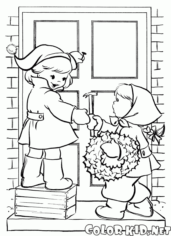 أطفال شنق اكليلا من الزهور تلوين صفحة